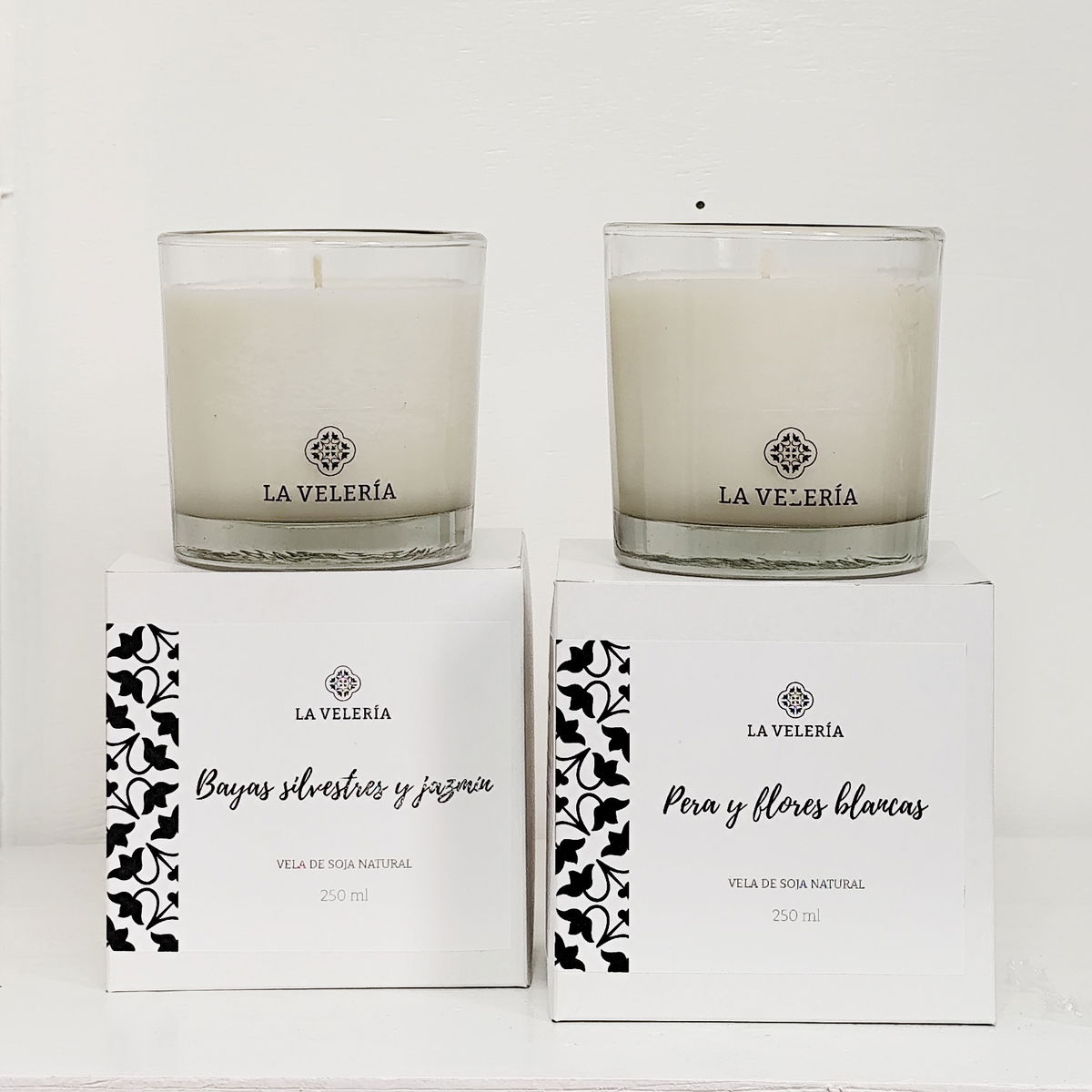 Vela en recipiente de vidrio de 8,3 cm de diámetro por 8,3 cm de alto. En caja.